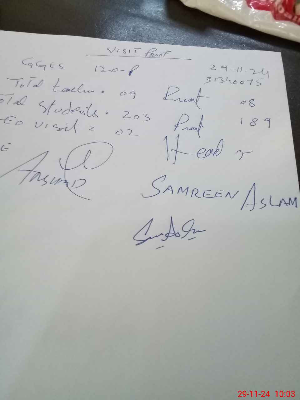 | Attendance Register | Head Teacher | MEA with School | Visit Proof |
