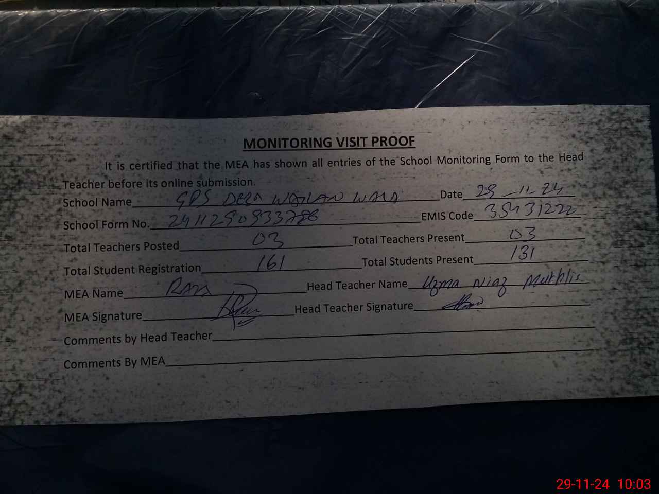 | EMIS Code: 35431222 | Name of School: GPS DERA WAILAN WALA | |||