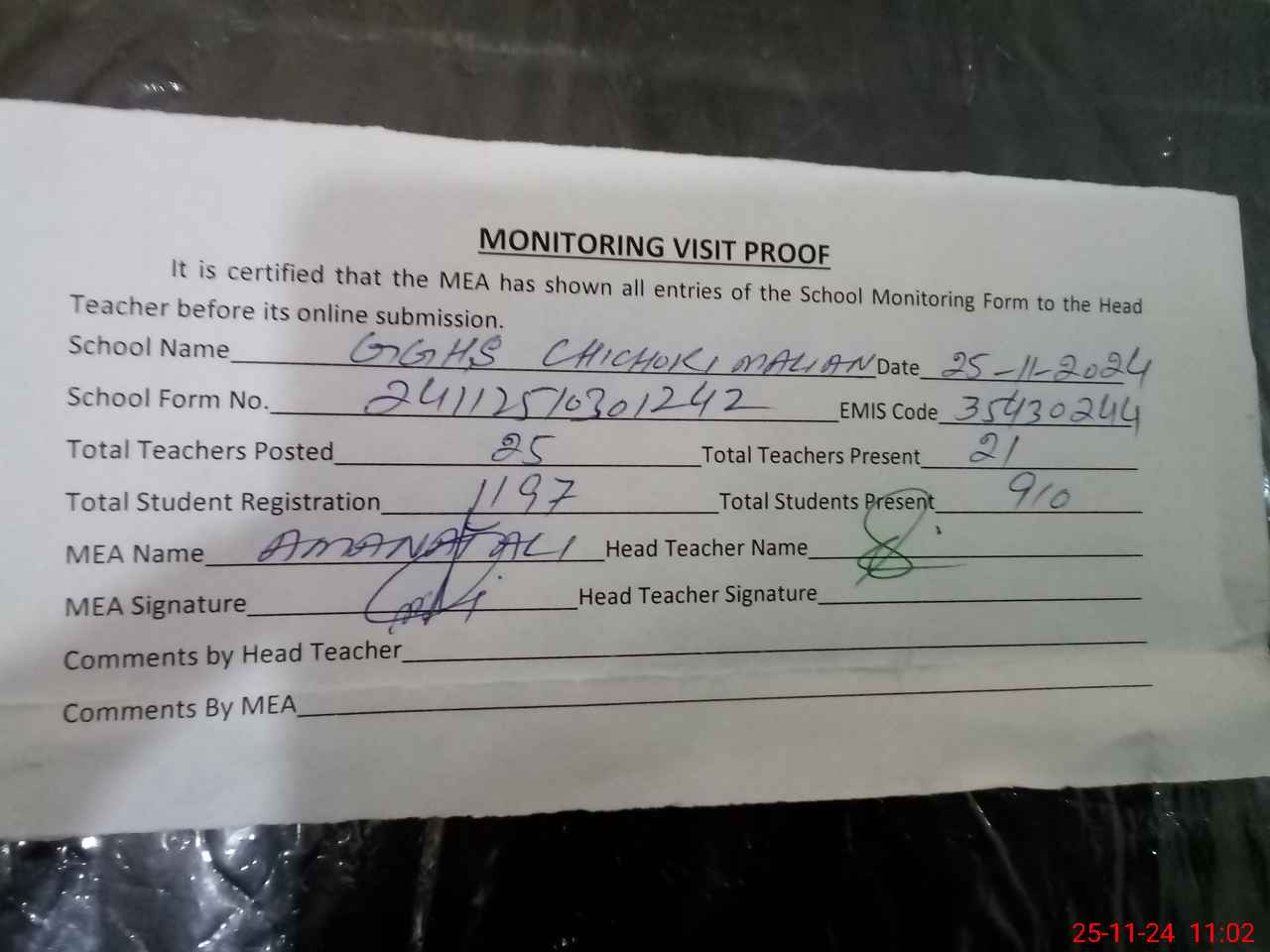 | Attendance Register | Head Teacher | MEA with School | Visit Proof |
