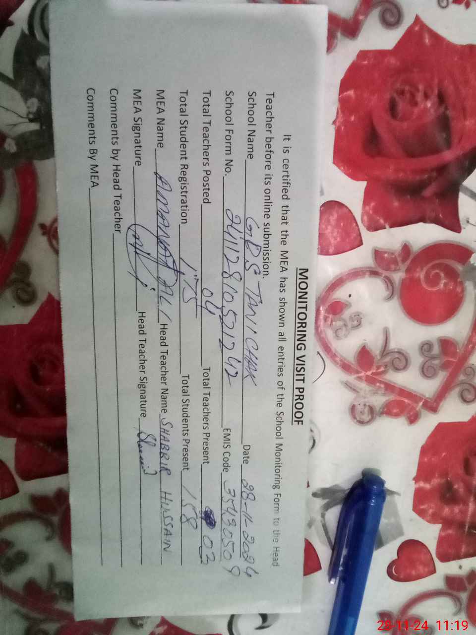 | Attendance Register | Head Teacher | MEA with School | Visit Proof |