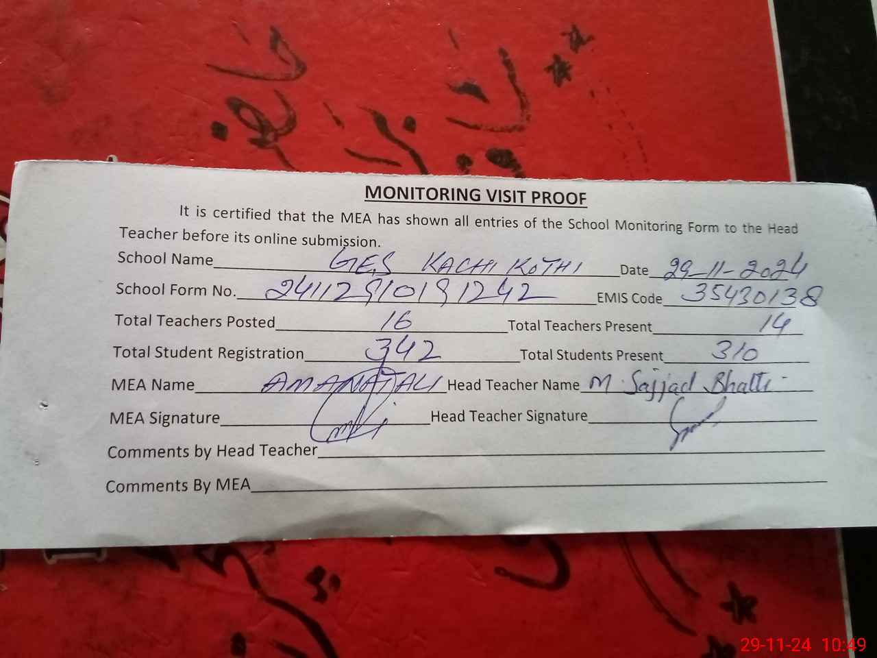 | Attendance Register | Head Teacher | MEA with School | Visit Proof |