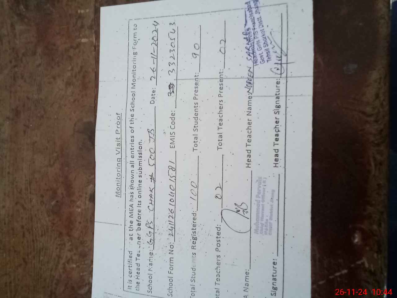 | EMIS Code: 33230543 | Name of School: GGPS CHAK NO 500 JB FRANCIS ABAD | |||