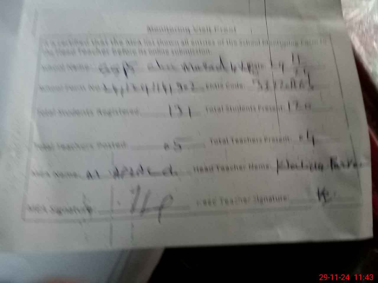 | Attendance Register | Head Teacher | MEA with School | Visit Proof |