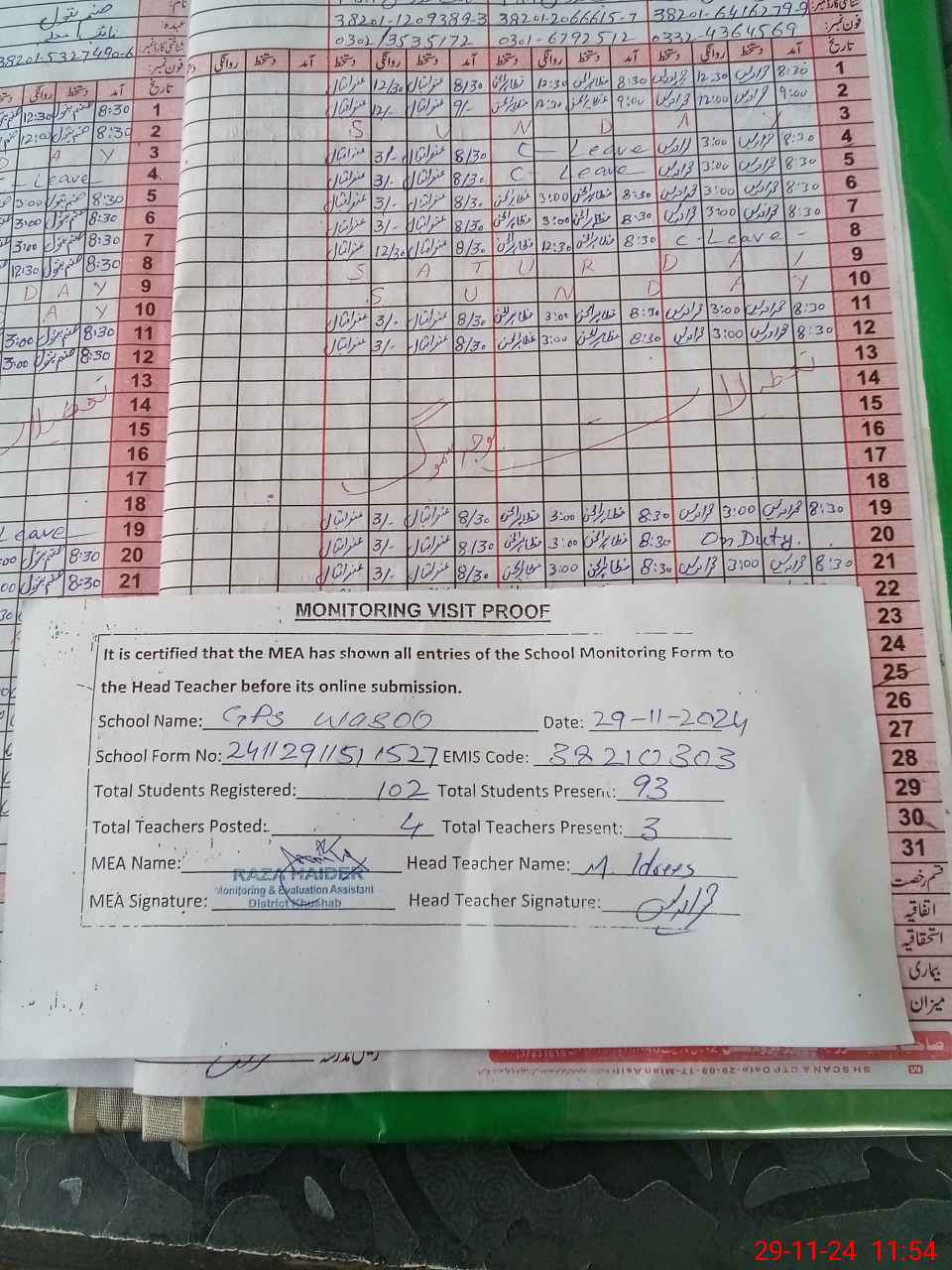 | Attendance Register | Head Teacher | MEA with School | Visit Proof |