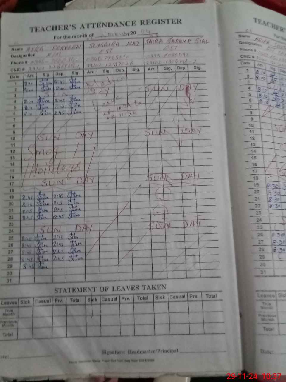 | CNIC | Full Name | Designation | R/C | Absence During Last Calender Month |