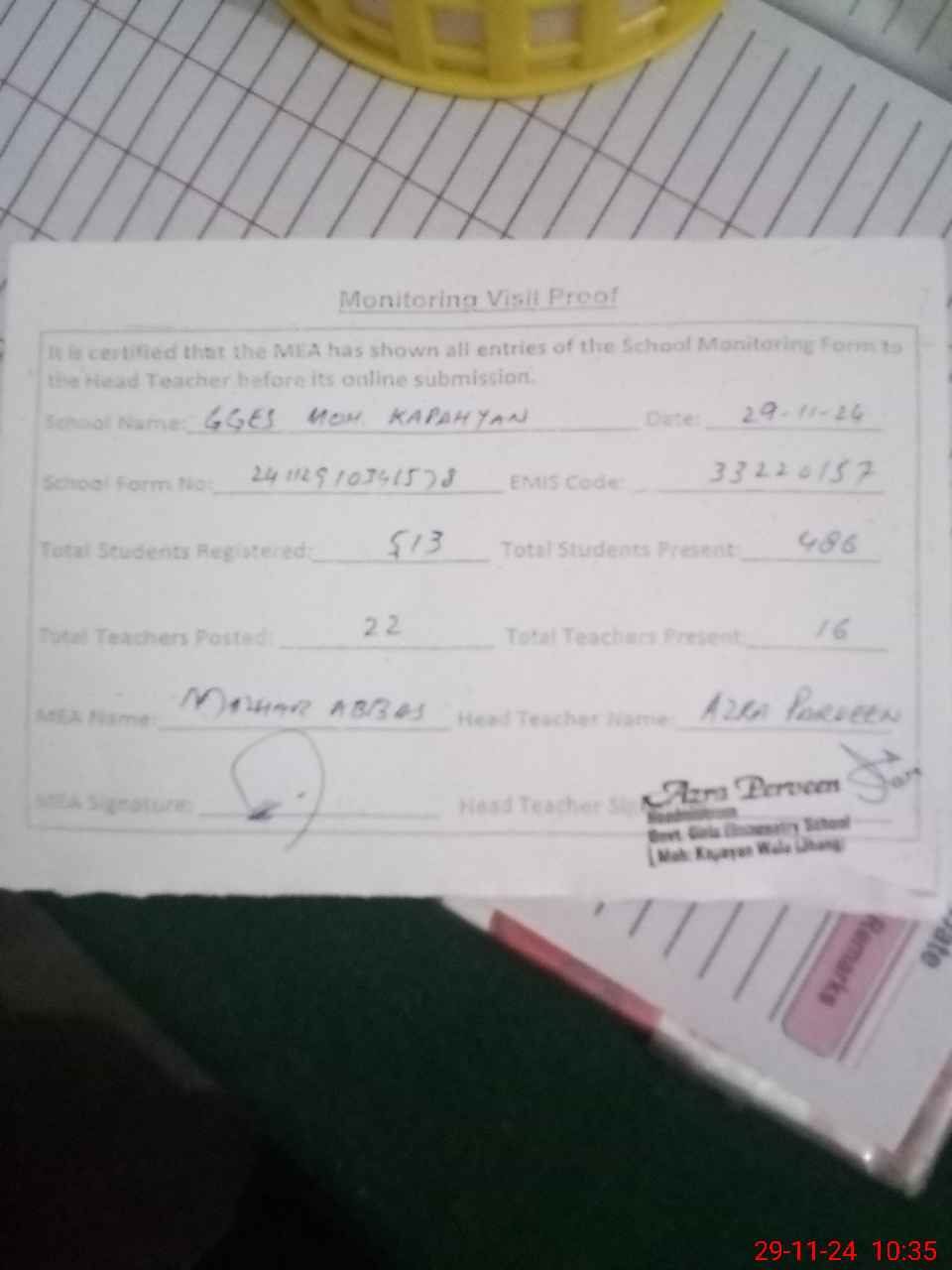 | Name: Az**** pe**** Designation: (School Headmaster's/Headmistress's) sse Phone/Cell Number: 03**** |