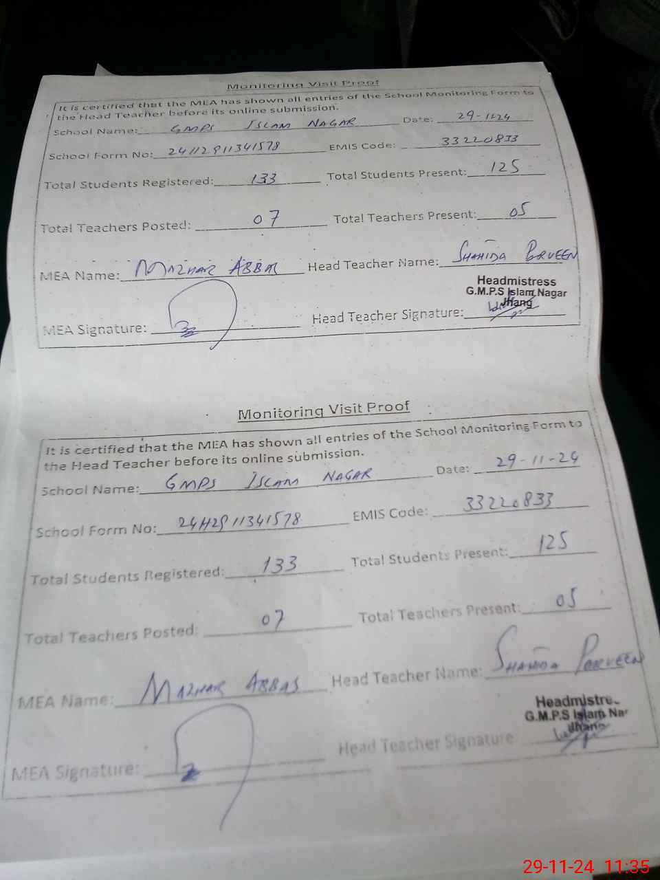 | EMIS Code: 33220833 | Name of School: GMPS ISLAM NAGAR | |||