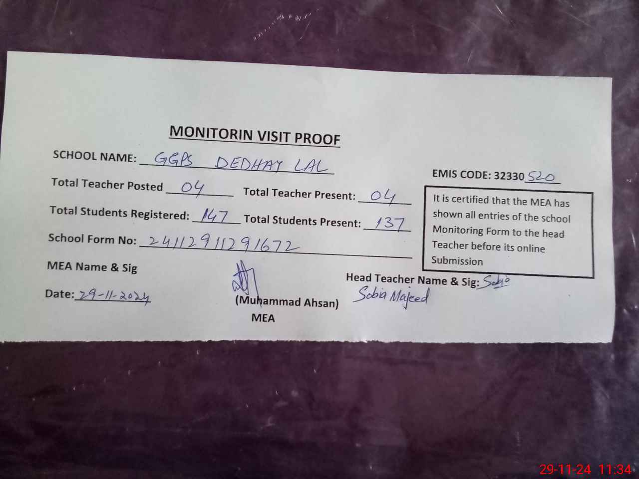 | Attendance Register | Head Teacher | MEA with School | Visit Proof |