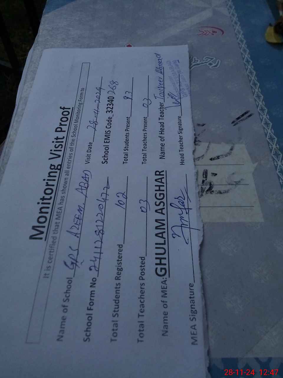 | EMIS Code: 32340268 | Name of School: GPS AZEEM ABAD | |||