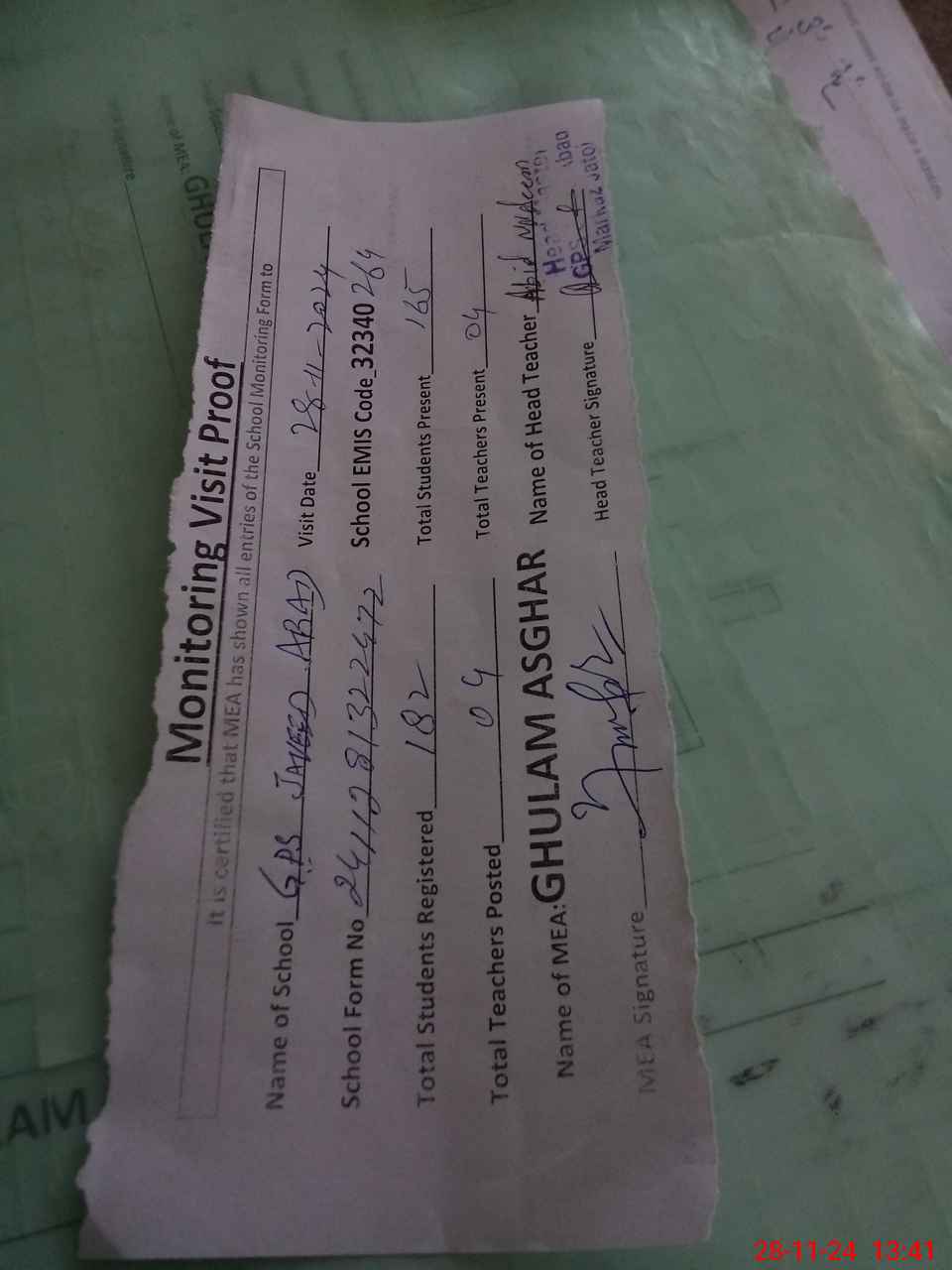 | Attendance Register | Head Teacher | MEA with School | Visit Proof |