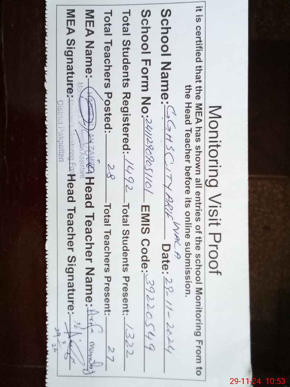 | Attendance Register | Head Teacher | MEA with School | Visit Proof |