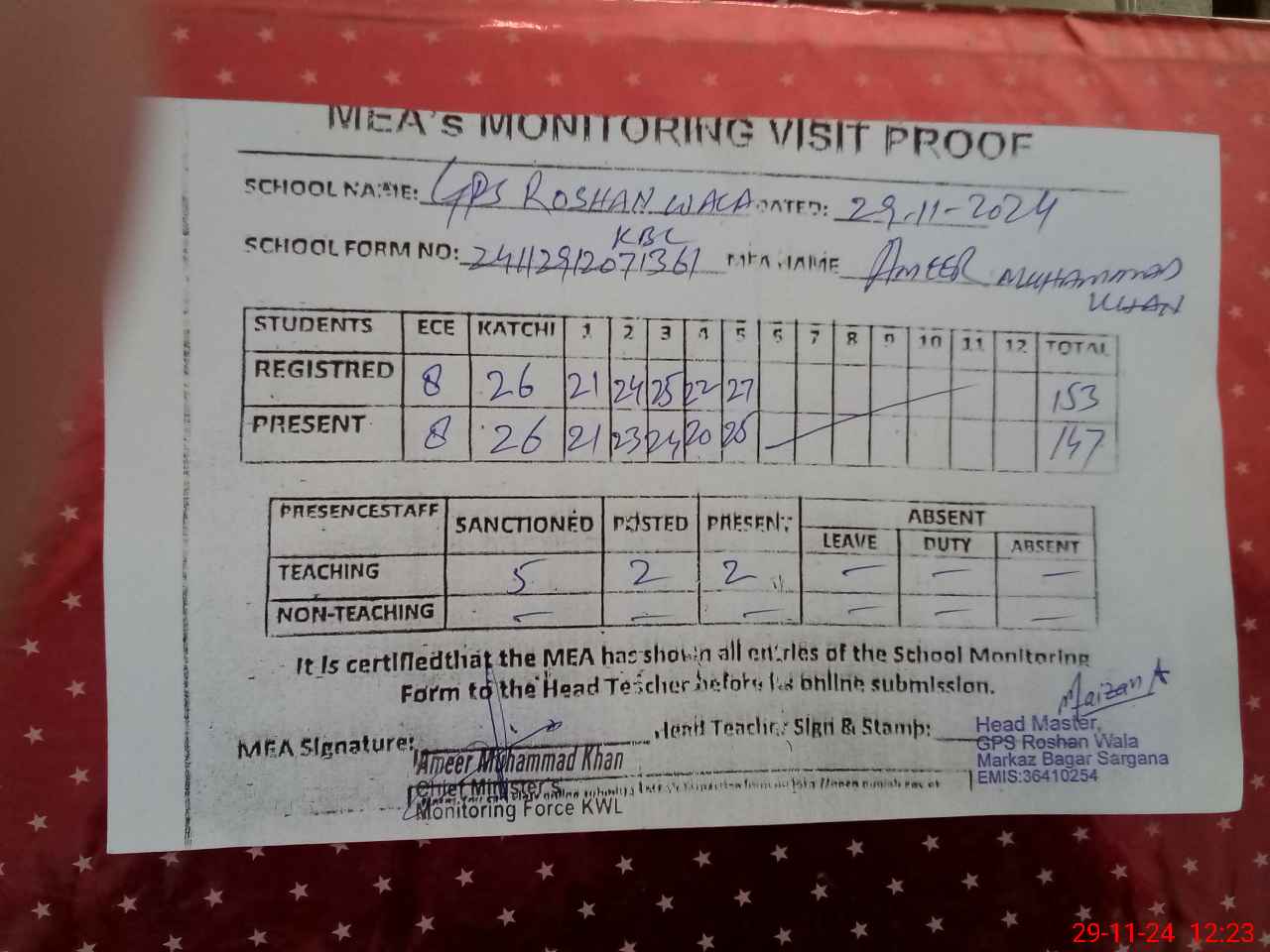 | Attendance Register | Head Teacher | MEA with School | Visit Proof |