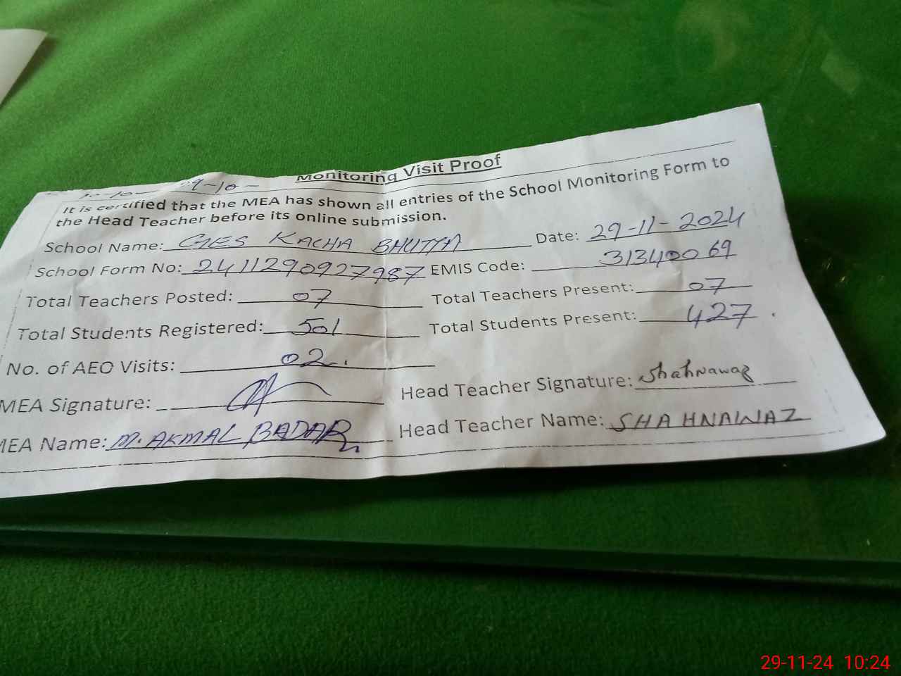 | Monitoring Date: 29-11-2024 | Start Time: 29-11-2024 09:27 AM | End Time: 29-11-2024 10:44 AM | Name of MEA: Mu**** Ak**** Ba**** | |