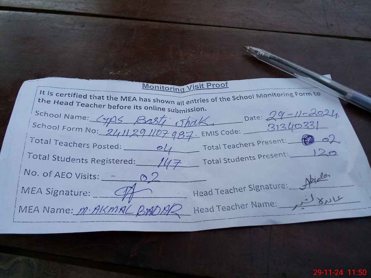 | Total no. of Classrooms: 6 No. of Classrooms Used for Teaching: 6 No. of Classrooms Storing Old Furniture, FTBs, etc: 0Comments if Any: Head teacher Arshad and teacher Zeeshan both are absent leave approved record not available at the time of inspection Nsb and FTF record not provided One tlt nonfunctional |