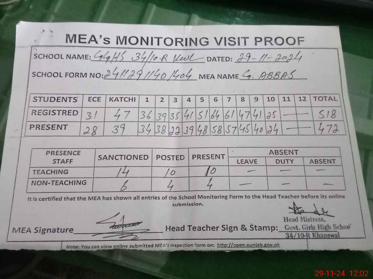 | Attendance Register | Head Teacher | MEA with School | Visit Proof |