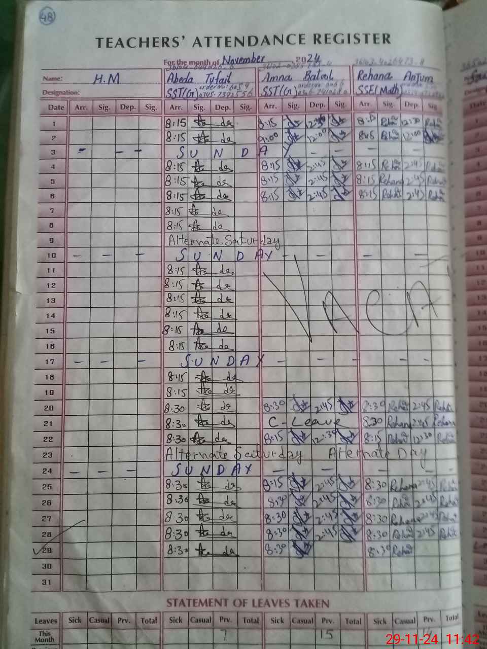 | CNIC | Full Name | Designation | R/C | Absence During Last Calender Month |