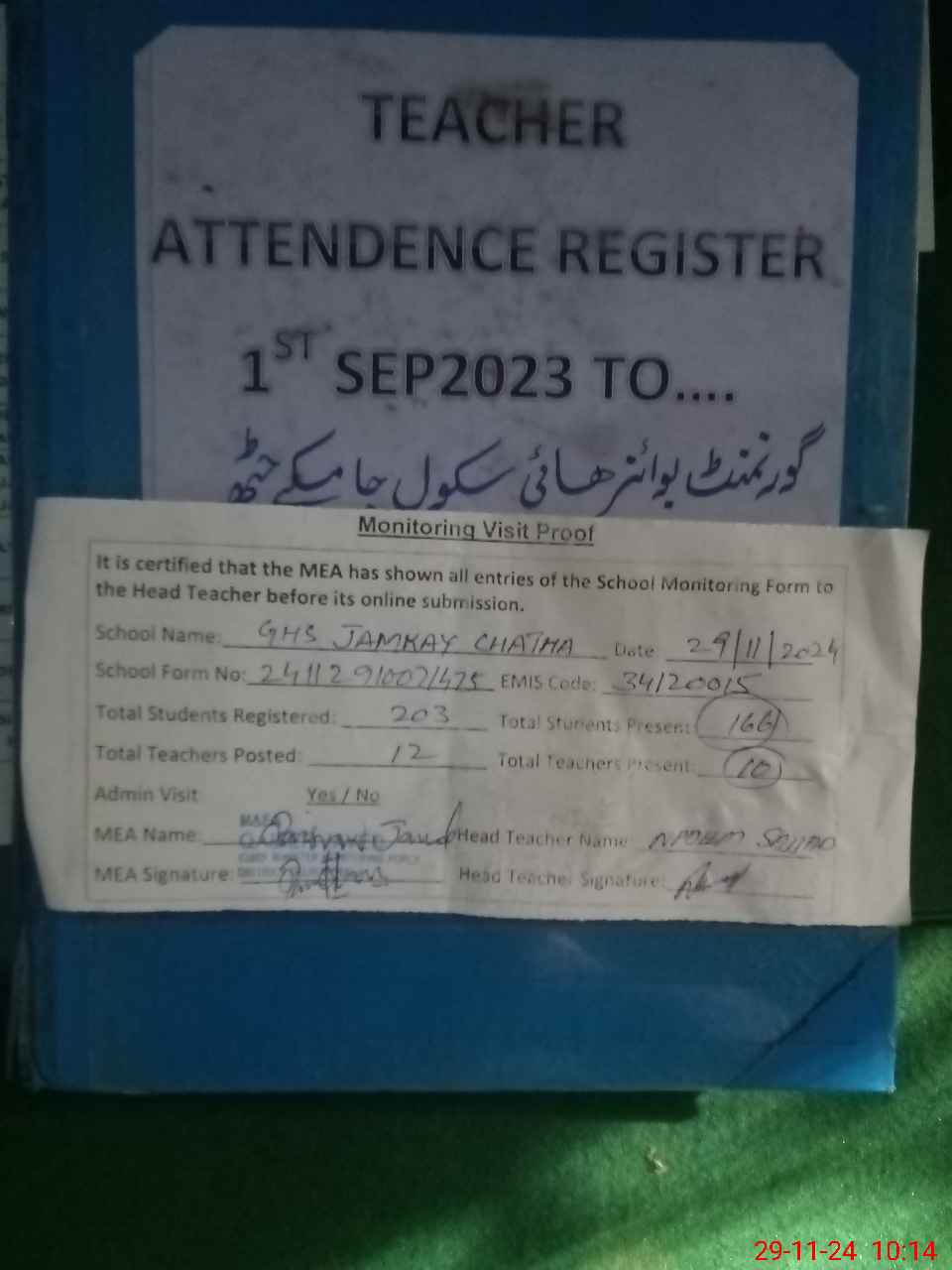| Attendance Register | Head Teacher | MEA with School | Visit Proof |