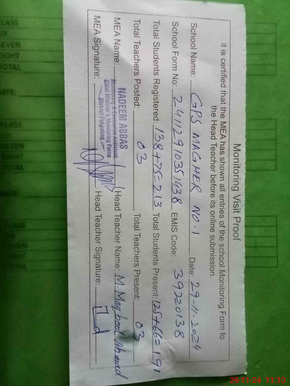 | Attendance Register | Head Teacher | MEA with School | Visit Proof |