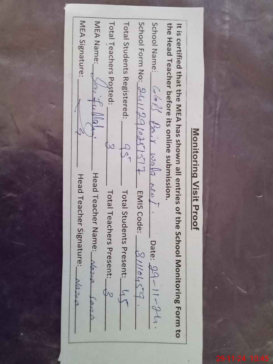 | EMIS Code: 31110459 | Name of School: GGPS BAIR WALA NO.1 | |||