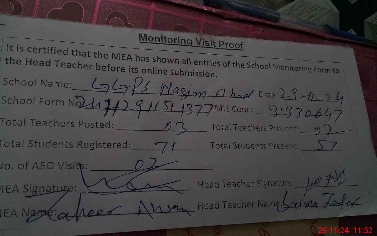 | Monitoring Date: 29-11-2024 | Start Time: 29-11-2024 11:11 AM | End Time: 29-11-2024 11:57 AM | Name of MEA: Za**** Ah**** | |