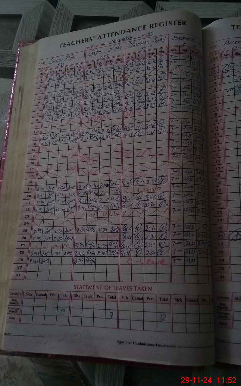 | CNIC | Full Name | Designation | R/C | Absence During Last Calender Month |
