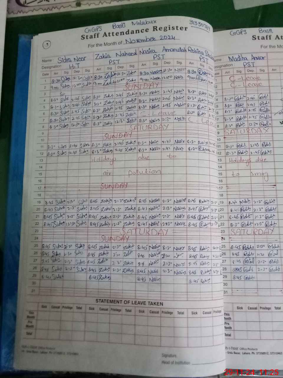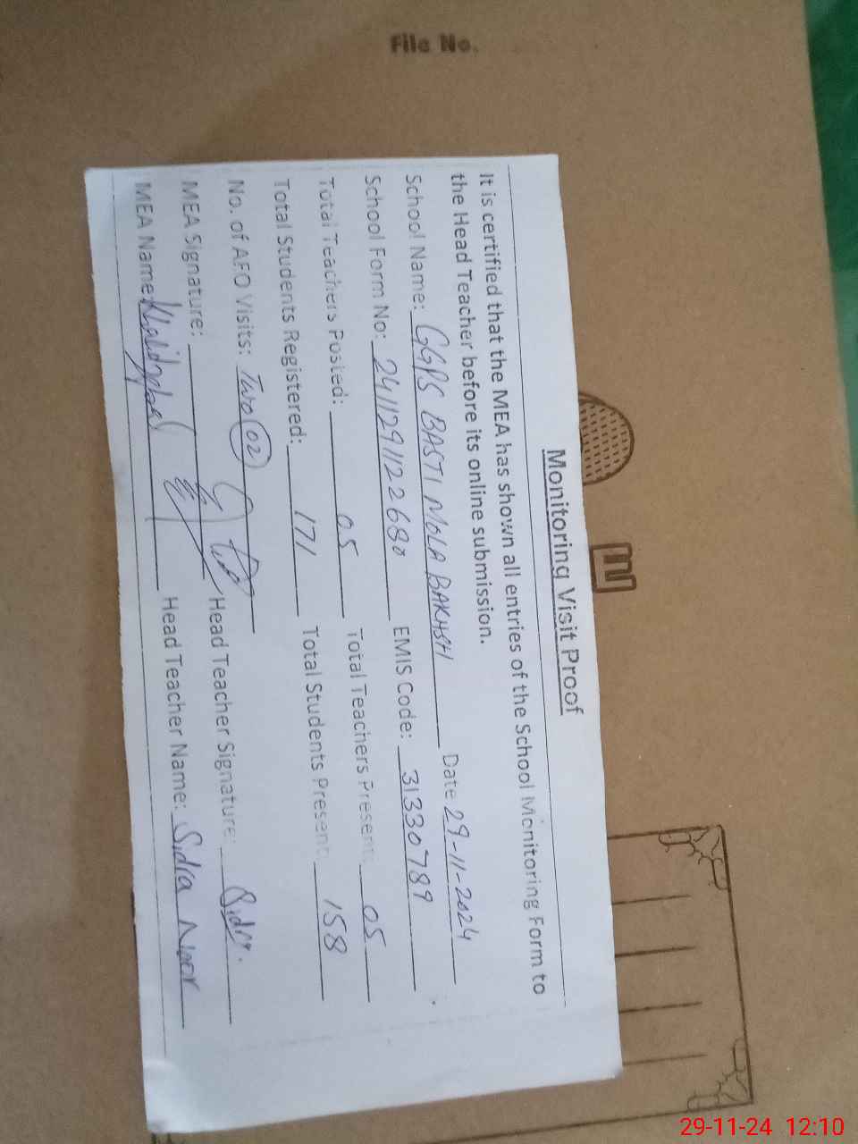 | Remarks (Use Separate Page if Required): Class verification is not updated on mea tab as per sis and teachers attendance updated on sis on 29 11 2024 and three classes are sitting under shed | |||||