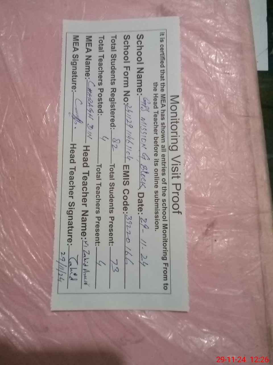 | Attendance Register | Head Teacher | MEA with School | Visit Proof |