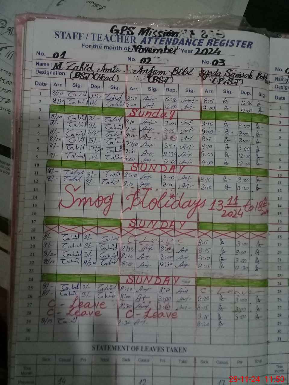 | CNIC | Full Name | Designation | R/C | Absence During Last Calender Month |