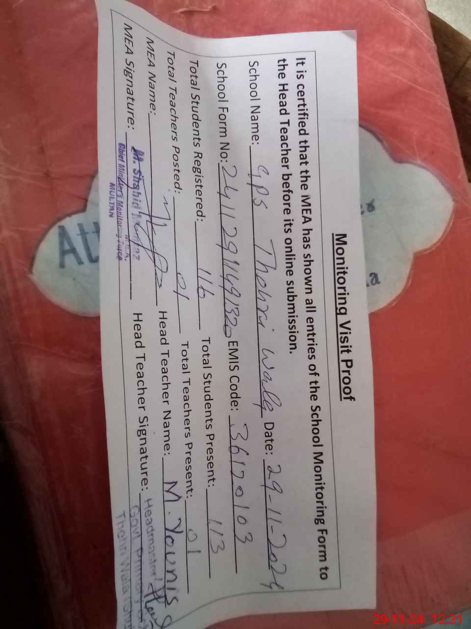 | Attendance Register | Head Teacher | MEA with School | Visit Proof |