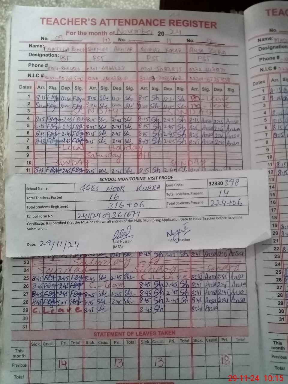 | Attendance Register | Head Teacher | MEA with School | Visit Proof |