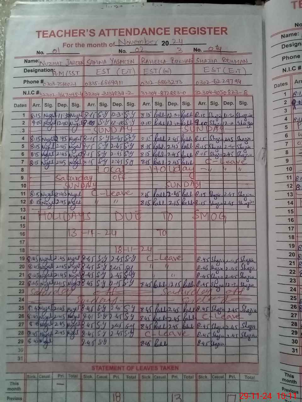 | CNIC | Full Name | Designation | R/C | Absence During Last Calender Month |
