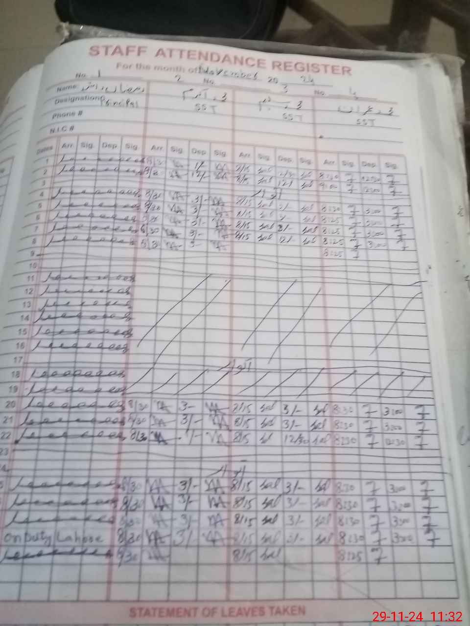 | CNIC | Full Name | Designation | R/C | Absence During Last Calender Month |