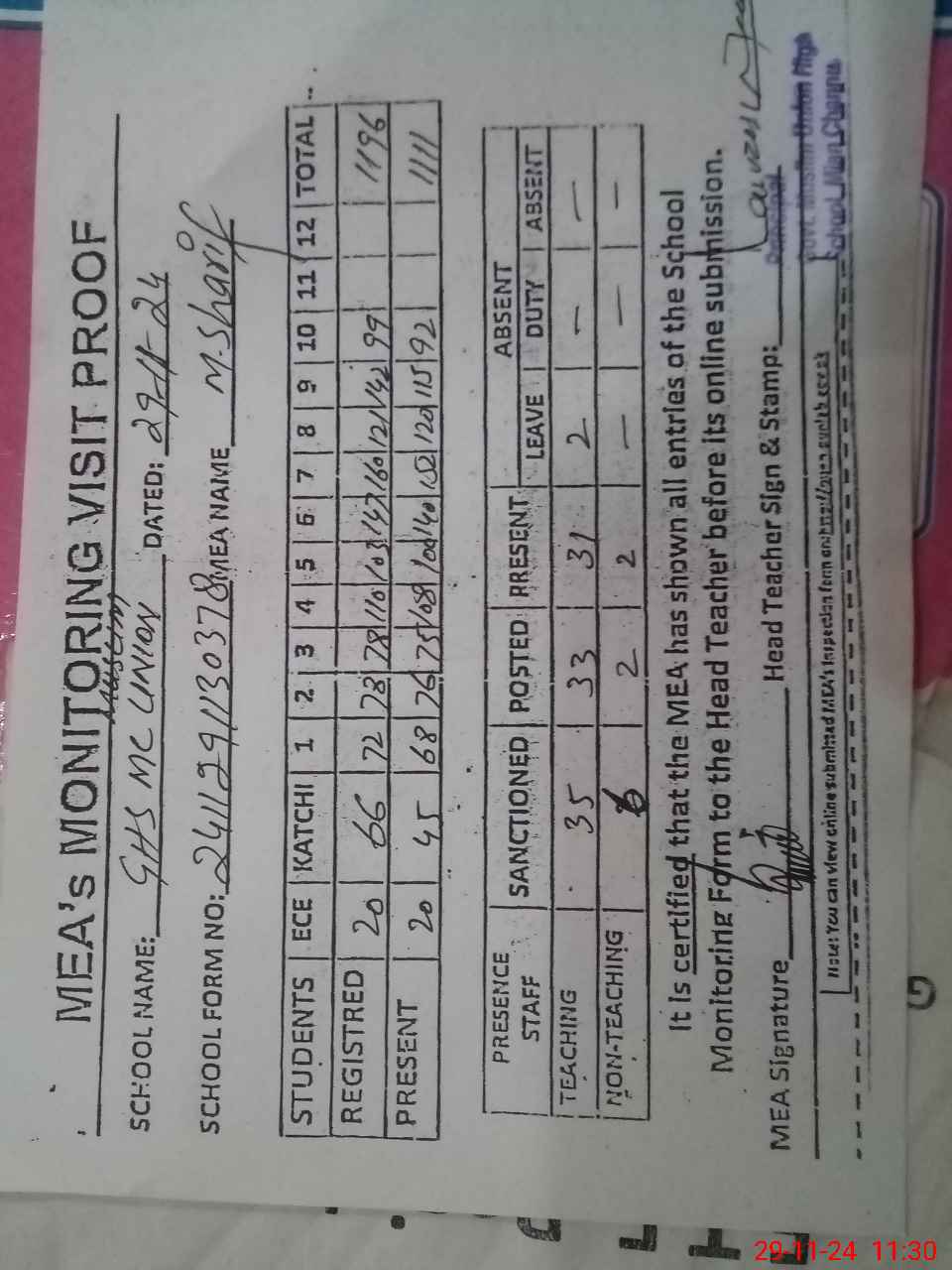 | Attendance Register | Head Teacher | MEA with School | Visit Proof |