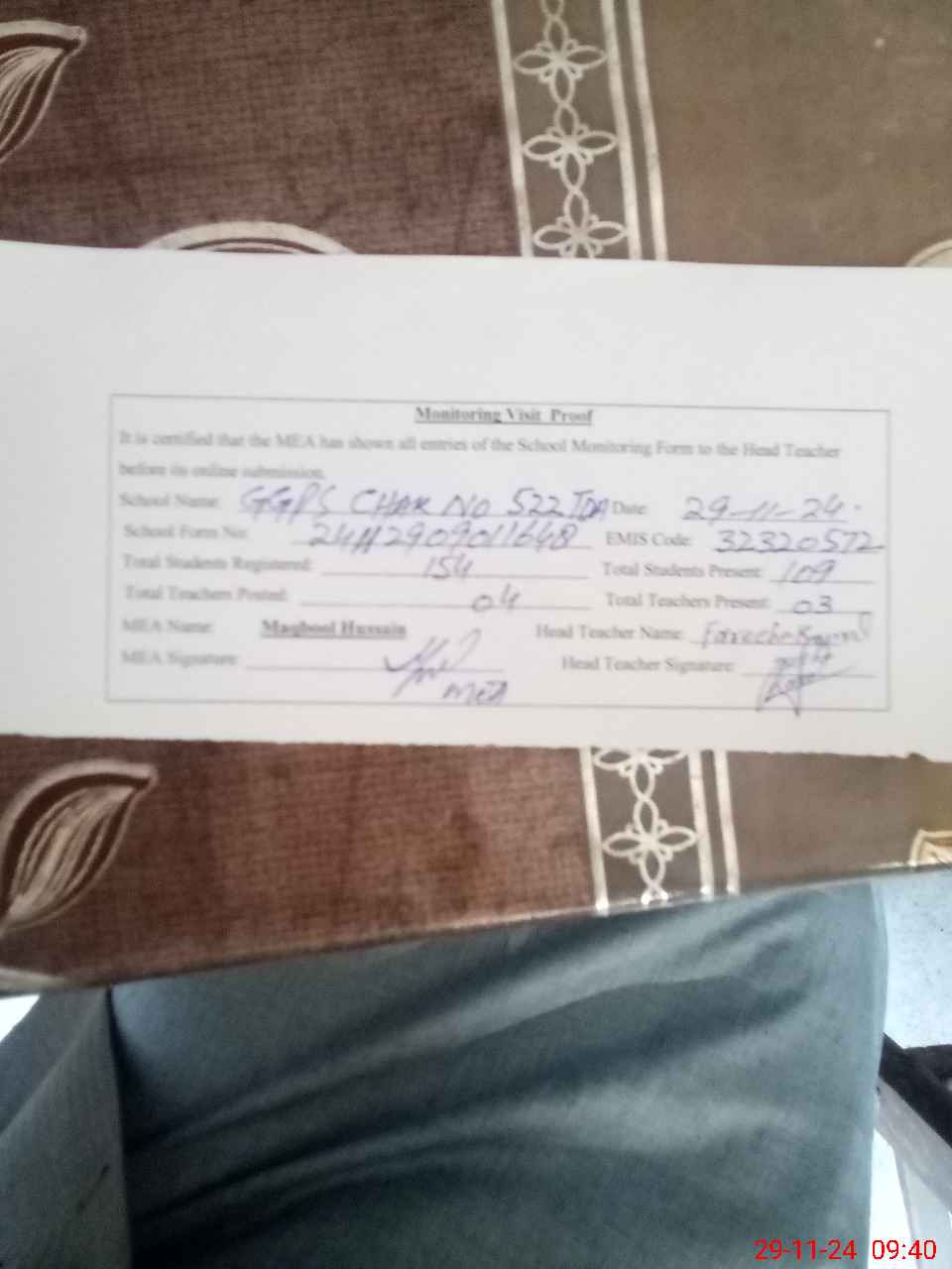 | Attendance Register | Head Teacher | MEA with School | Visit Proof |