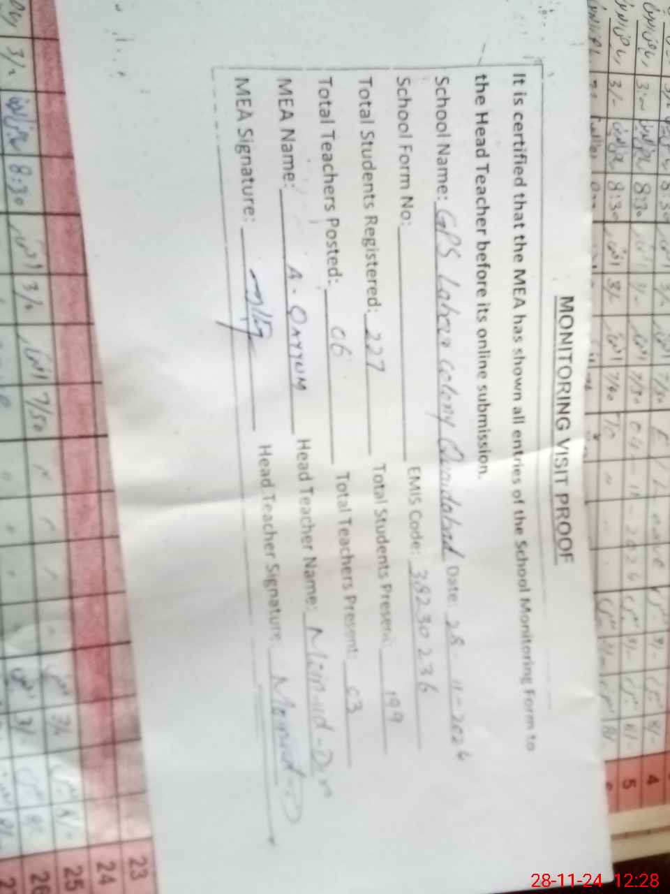 | Attendance Register | Head Teacher | MEA with School | Visit Proof |