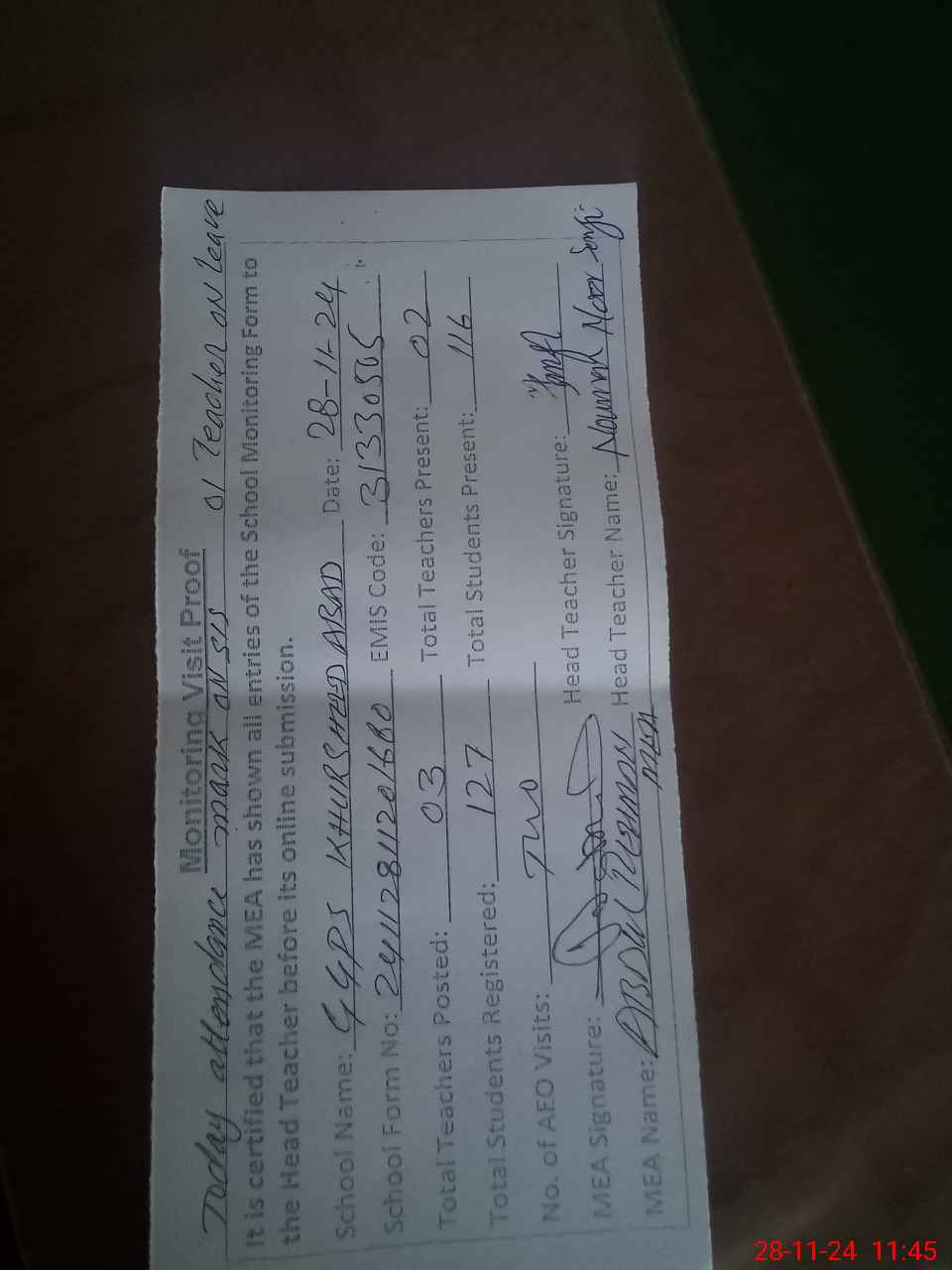 | Attendance Register | Head Teacher | MEA with School | Visit Proof |