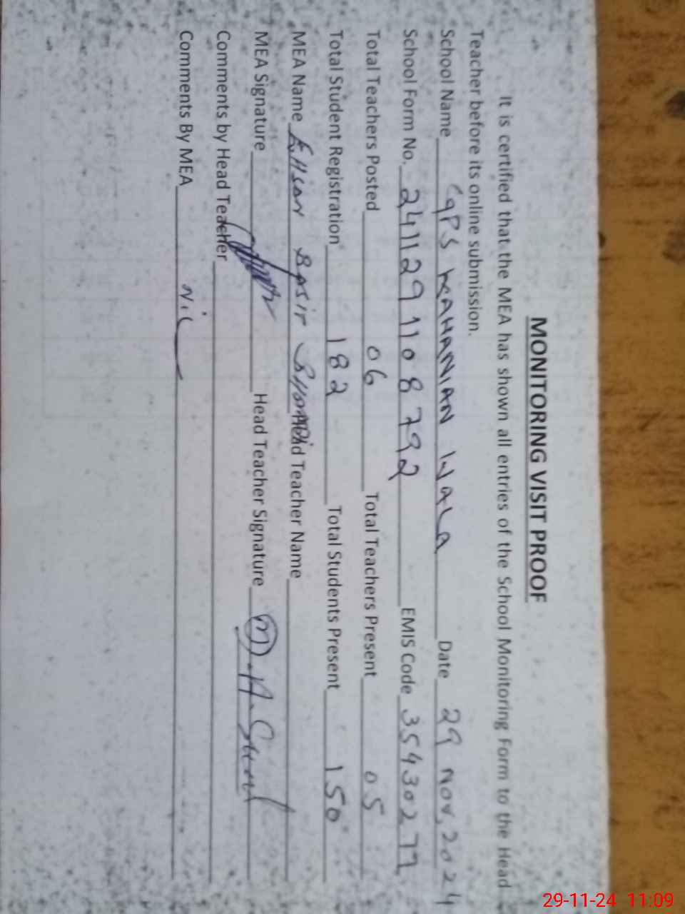 | Attendance Register | Head Teacher | MEA with School | Visit Proof |