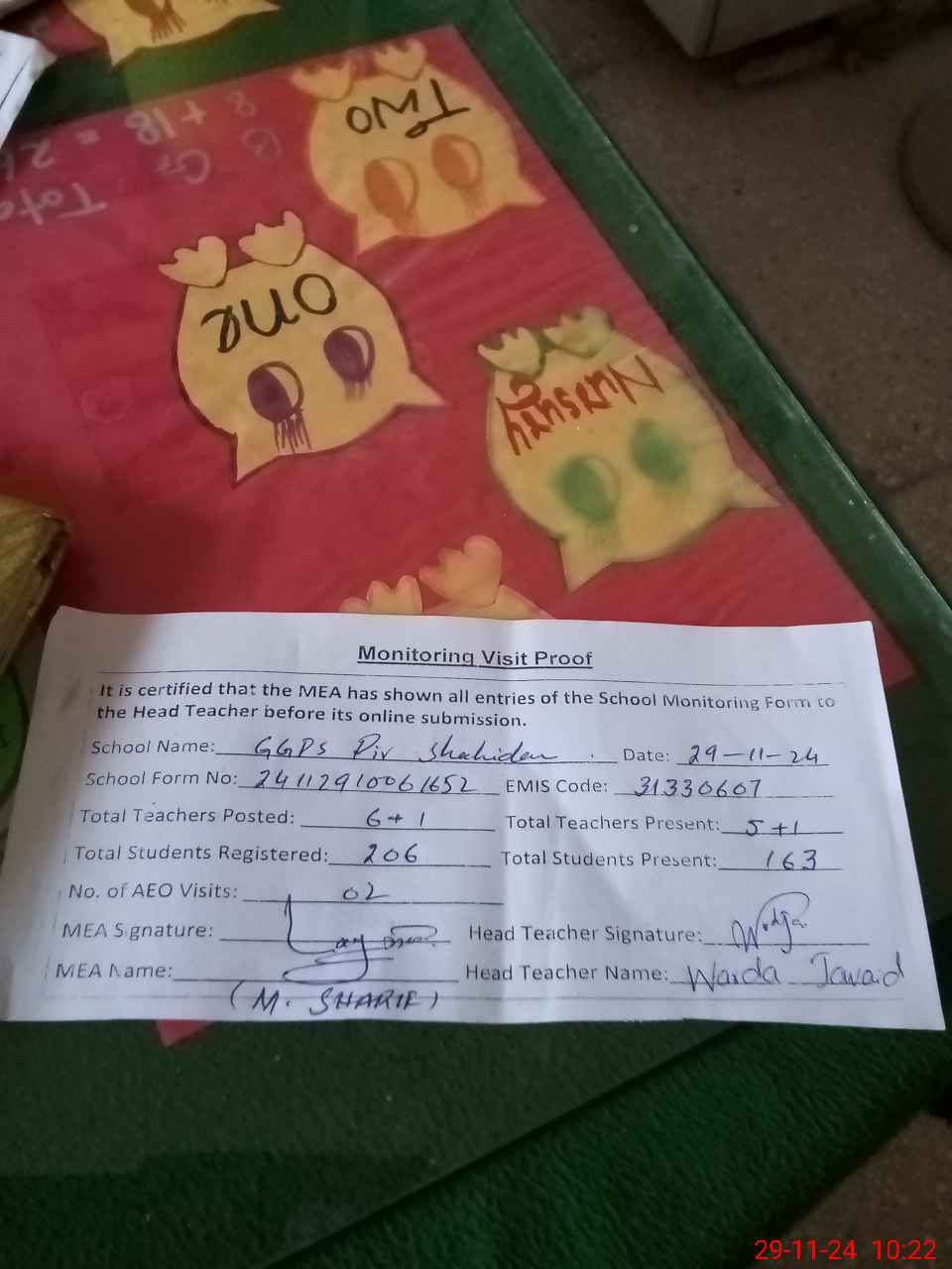 | Attendance Register | Head Teacher | MEA with School | Visit Proof |