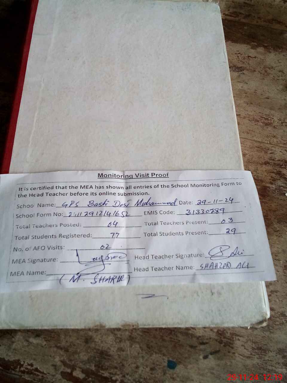 | Attendance Register | Head Teacher | MEA with School | Visit Proof |