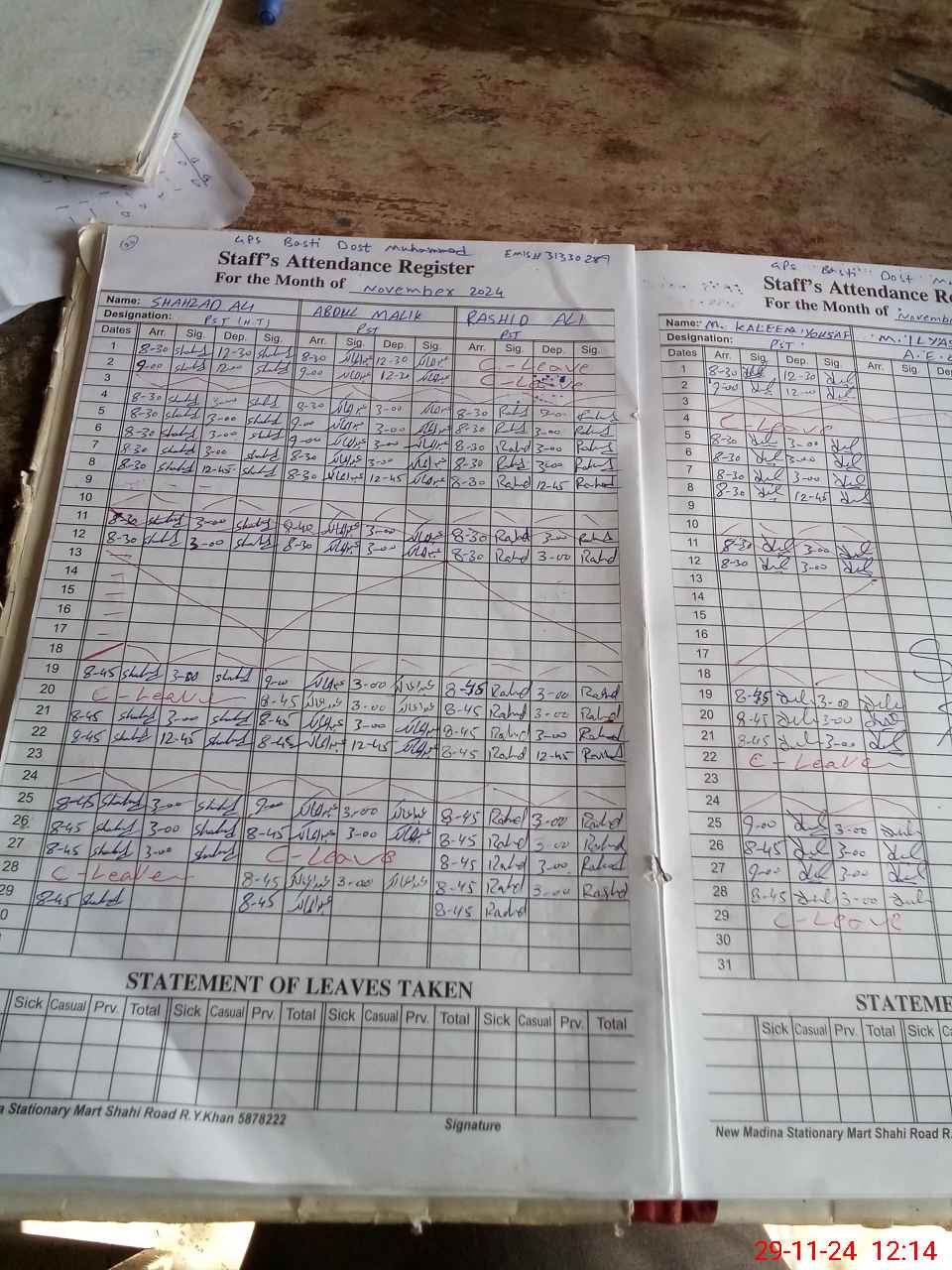 | CNIC | Full Name | Designation | R/C | Absence During Last Calender Month |