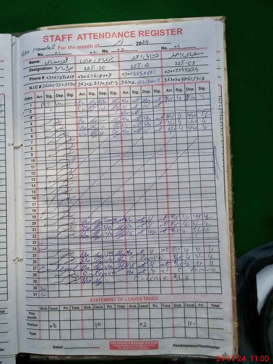 | CNIC | Full Name | Designation | R/C | Absence During Last Calender Month |
