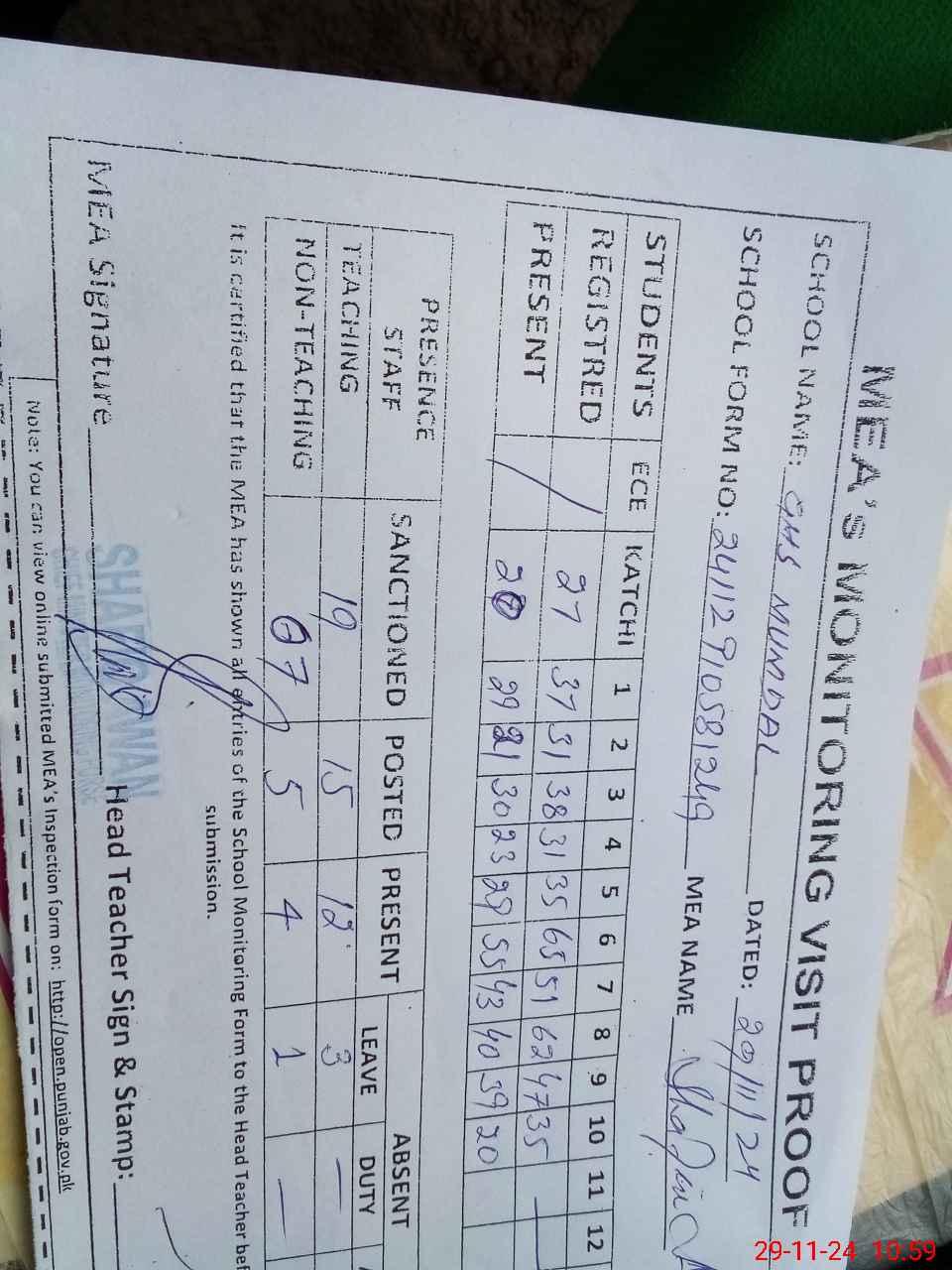 | Attendance Register | Head Teacher | MEA with School | Visit Proof |