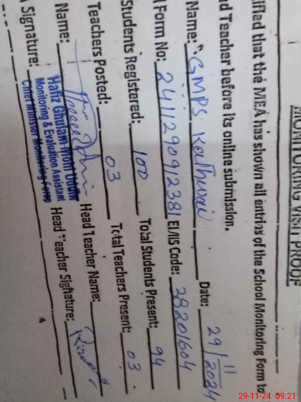 | Monitoring Date: 29-11-2024 | Start Time: 29-11-2024 08:52 AM | End Time: 29-11-2024 09:26 AM | Name of MEA: HA**** GH**** MO**** UDDI**** | |