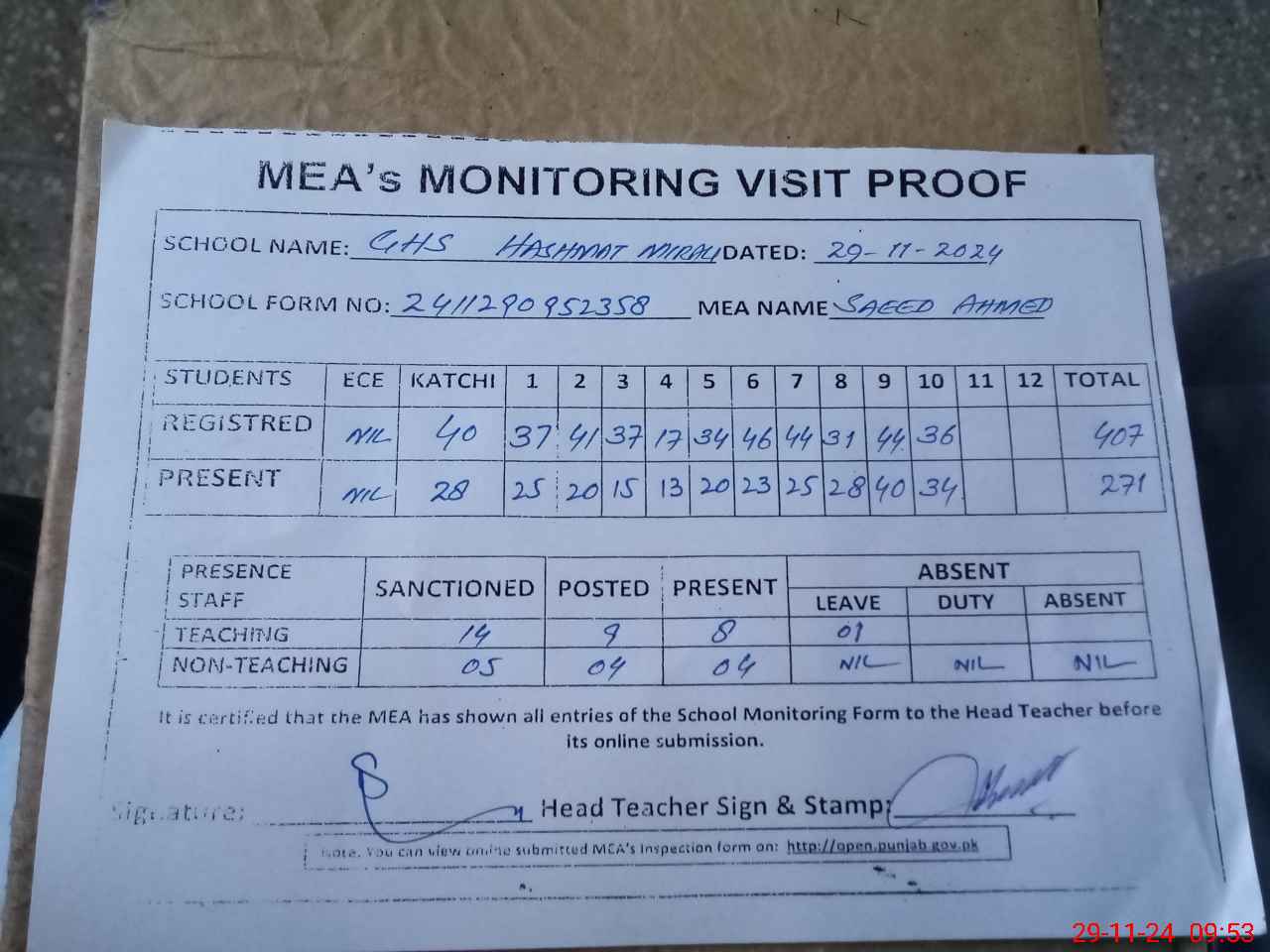| EMIS Code: 36410057 | Name of School: GHS HASHMAT MIRALI, SARAI SIDHU | |||