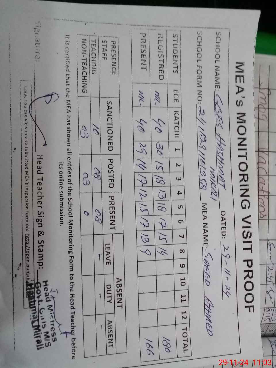 | Attendance Register | Head Teacher | MEA with School | Visit Proof |