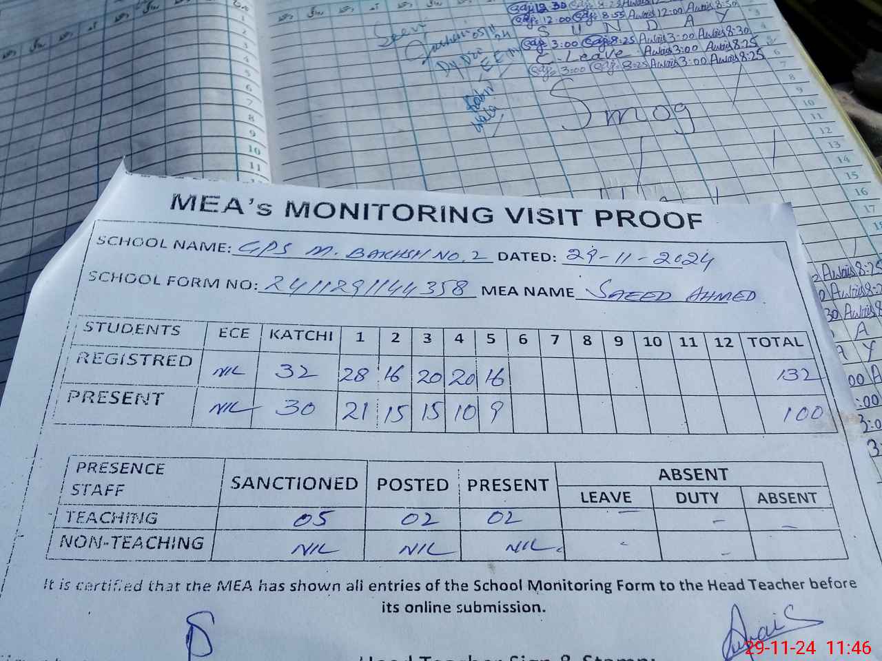 | Attendance Register | Head Teacher | MEA with School | Visit Proof |