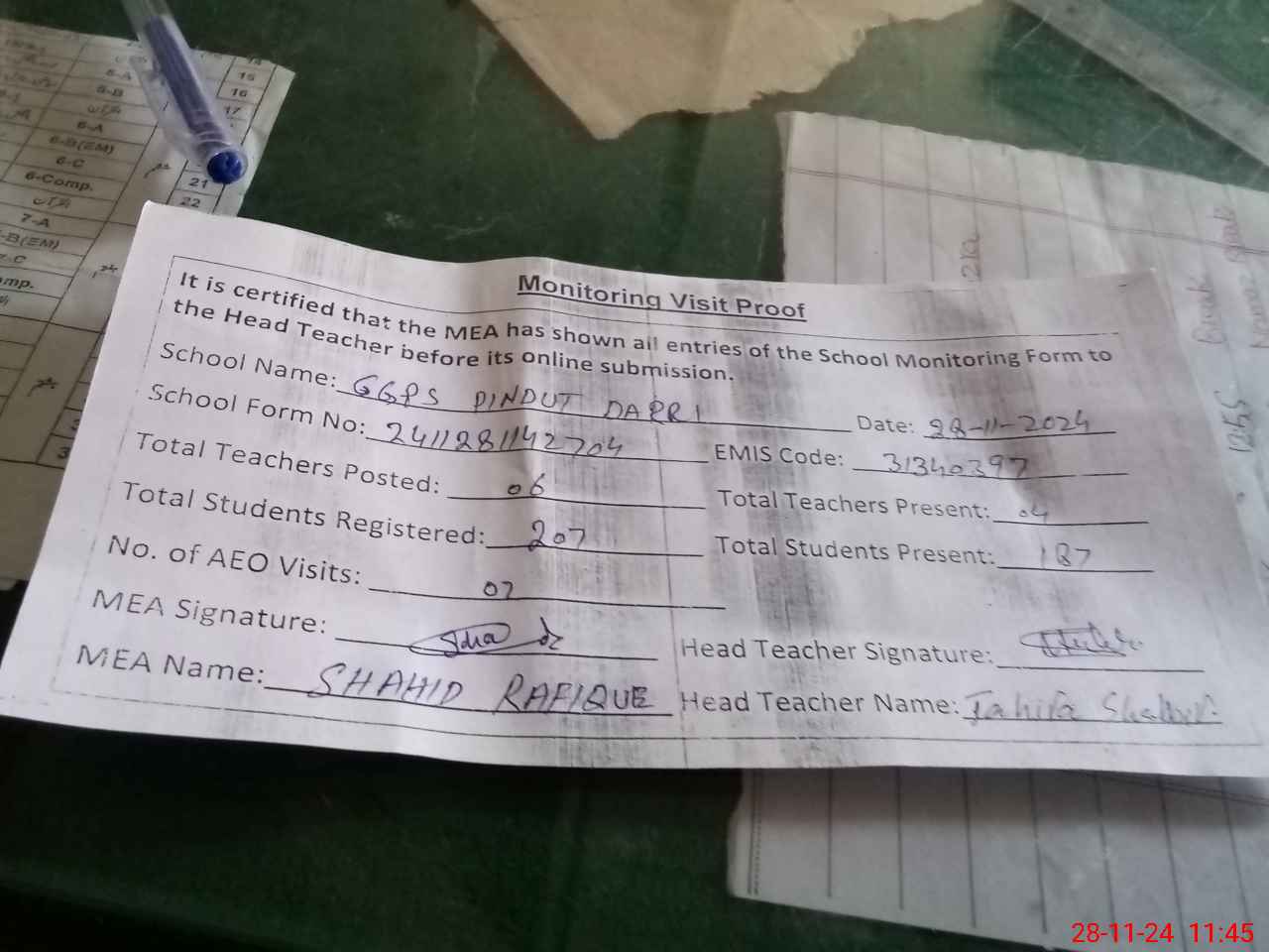 | Attendance Register | Head Teacher | MEA with School | Visit Proof |