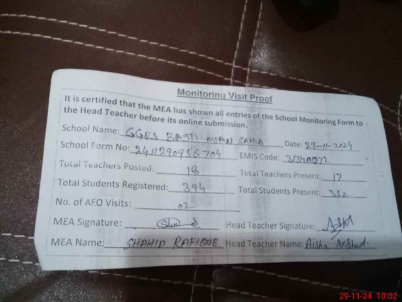 | Monitoring Date: 29-11-2024 | Start Time: 29-11-2024 09:38 AM | End Time: 29-11-2024 10:03 AM | Name of MEA: Sh**** Ra**** | |