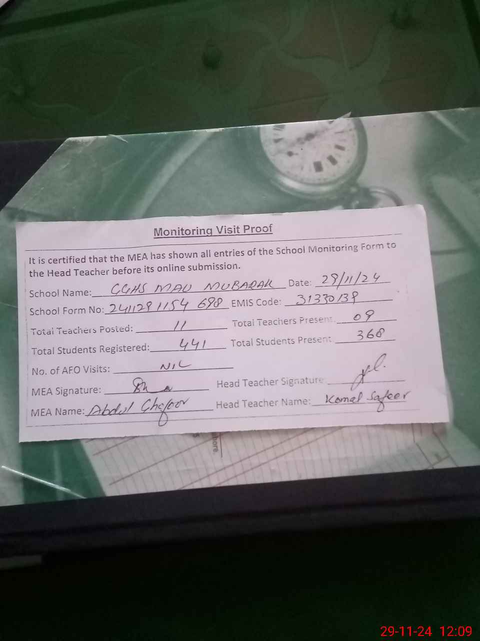 | Attendance Register | Head Teacher | MEA with School | Visit Proof |