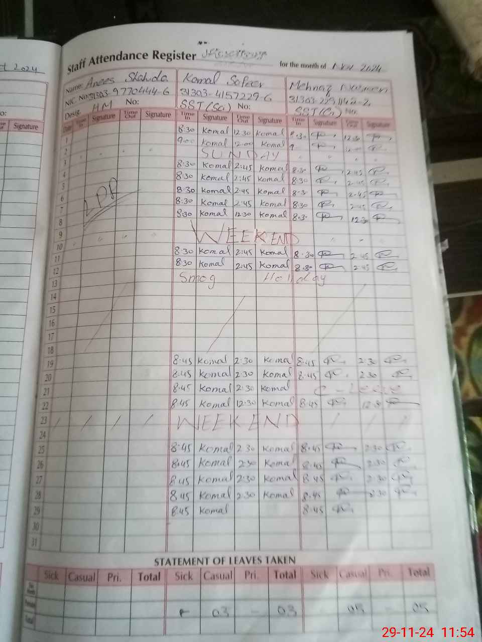 | CNIC | Full Name | Designation | R/C | Absence During Last Calender Month |